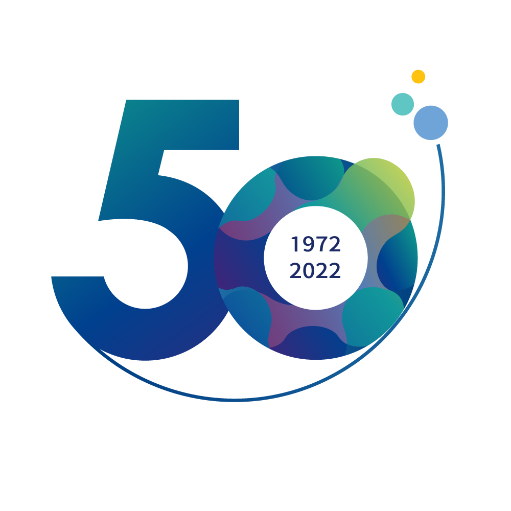 개원 50주년을 기념하는 엠블럼은 병원 심볼마크를 응용한 디자인으로 유기체 운동에 의한 생명체를 상징하며 생명존중 병원임을 의미합니다. 원을 벗어난 유기체는 미래 의료를 향해 뻗어가는 충남대학교병원의 저력과 도약을 상징합니다. 하단 반원은 지구와 세계 속의 충남대학교병원의 비전을, 외부 3개의 원은 새롭게 태어나는 병원의 핵심 가치를 담고 있습니다.